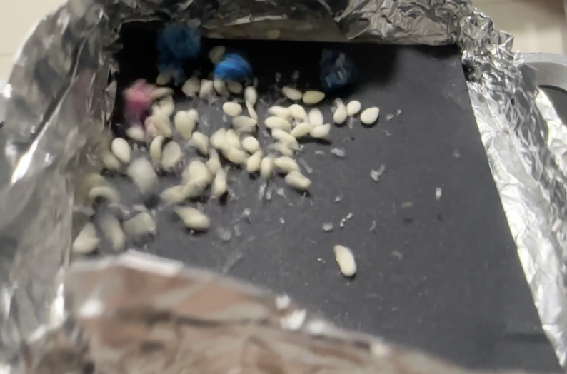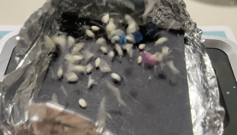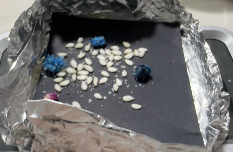 This time round, I placed the smaller aluminium tray on the speaker instead of the speaker’s bass to see if there’s any difference in how the salt, sesame seeds and flowers react.
