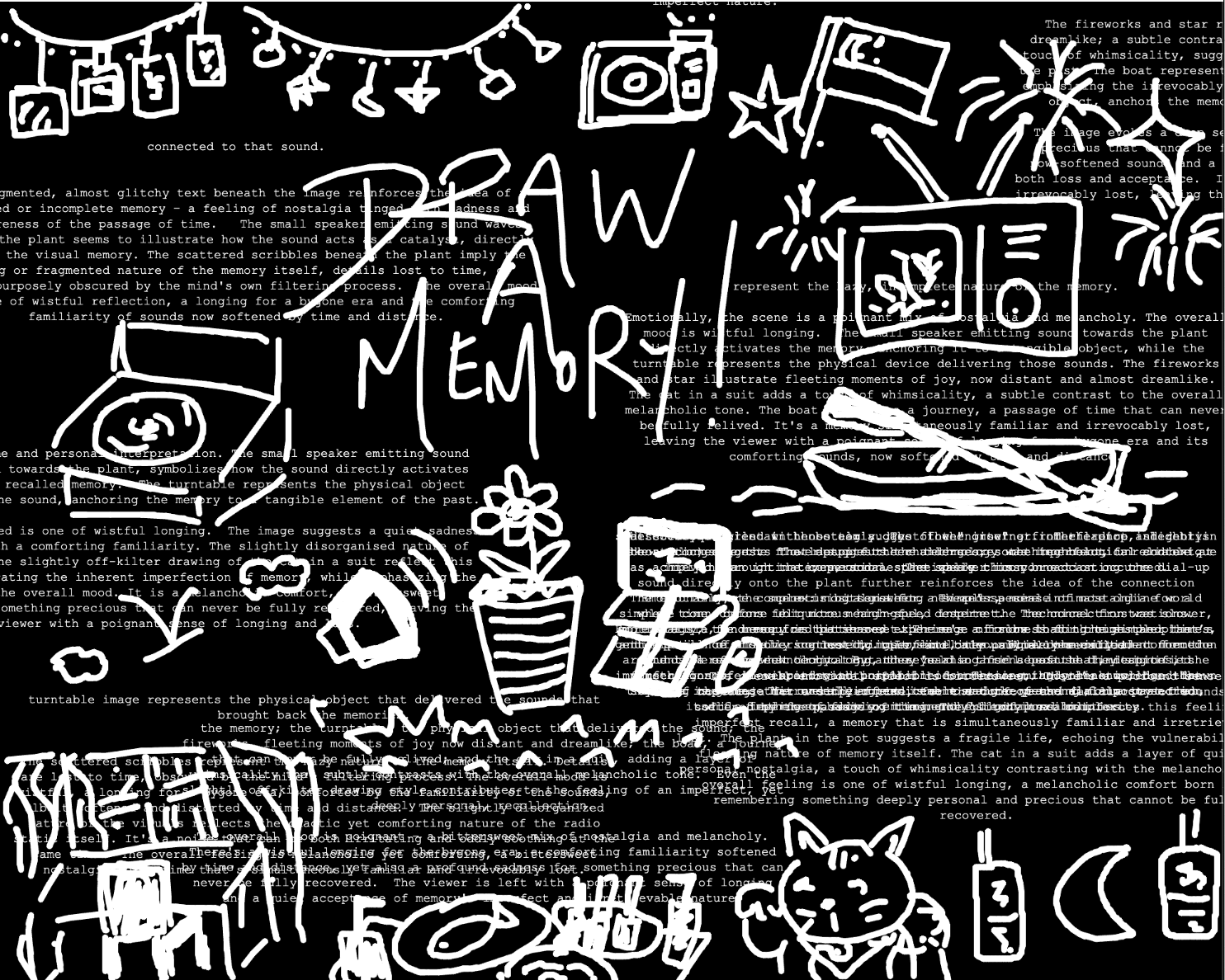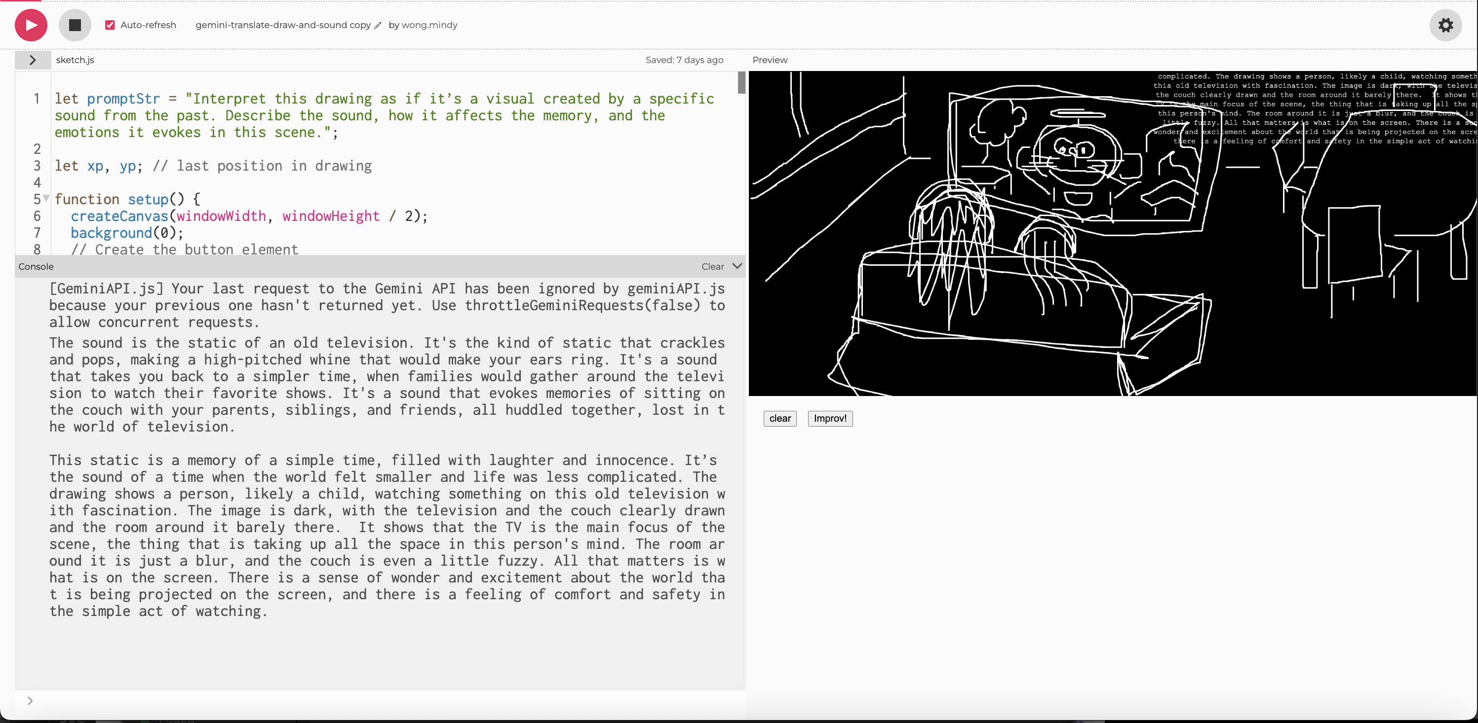 Users interact by drawing out a recalled memory. Upon pressing the ‘improv!’ button, a frequency sound either low, mid or high could be heard and a paragraph of the memory-based drawing will be generated. This is done using Gemini API prompts in the p5.js code. Users will also alternate between a mouse, trackpad and wacom tablet to see which is most comfortable for drawing.