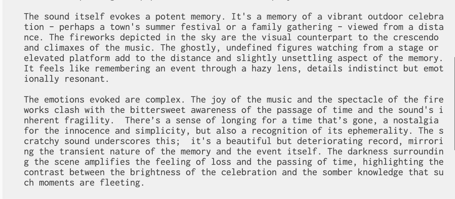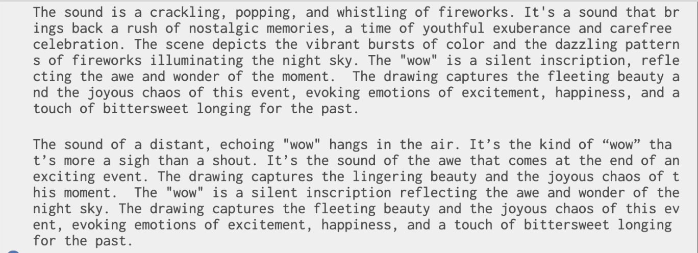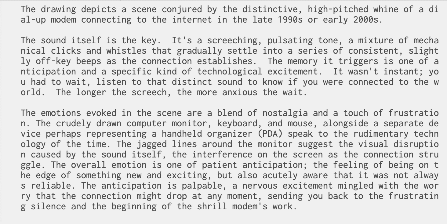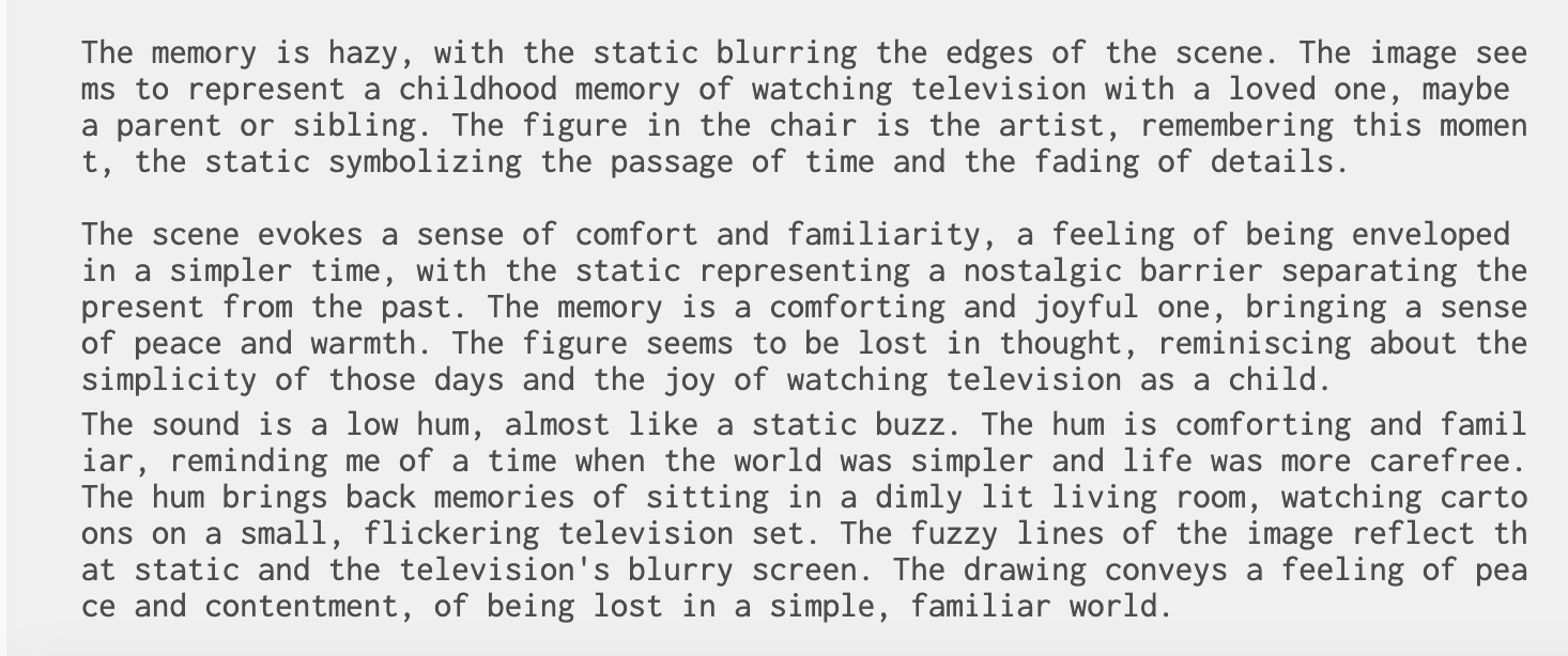 Through user-testings, it is said that a drawing interface retains a human touch (50% human 50% AI intelligence), making it an expressive experience. Every drawing is also unique, one of a kind and personal. The generated paragraphs based on drawings are fun to read, encouraging engagement. The generated sound frequency is a nice touch to an audio-visual experience. Sometimes the sentences can be so accurate, it hits close to home. Other times, a miss in accuracy can trigger a good laugh.